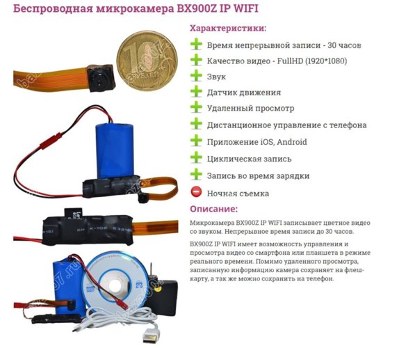| Беспроводная микрокамера IP WIFI BX900Z | Пишет видео и звук на карту памяти SD транслирует видеосигнал по радиоканалу (WIFI). Сигнал может приниматься непосредственно по WIFI соединению, либо передаваться удаленно - по интернету, в том числе и мобильному 3g 4g в любую точку мира. Работает без подзарядки АБ 20ч. Пишет видео при зарядке АБ. |